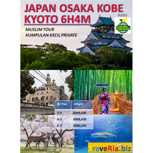 Tempat Lawatan: Osaka - Nagai Park, Osaka Castle, Nara Park, Univesal Studio Japan (Optional), Dotonbori, Namba, Masjid Istiqlal Osaka; Kyoto: Sungai Katsura, Arashiyama, Pasar Noshiki, Gion, Fushimi Inari; Kobe: Taman Herba Nunobaki, Masjid Kobe. | Skim Bayaran Mudah RM144/bulan x 48 bulan | NOTA: HARGA MUNGKIN BERUBAH MENGIKUT HARGA TIKET PENERBANGAN SEMASA. ITINERARI, HARGA MUKTAMAD DAN TERMA PEMBAYARAN DIMAKLUMKAN DALAM SEBUTHARGA RASMI YANG AKAN DIBERIKAN SETELAH TEMPAHAN DITERIMA.