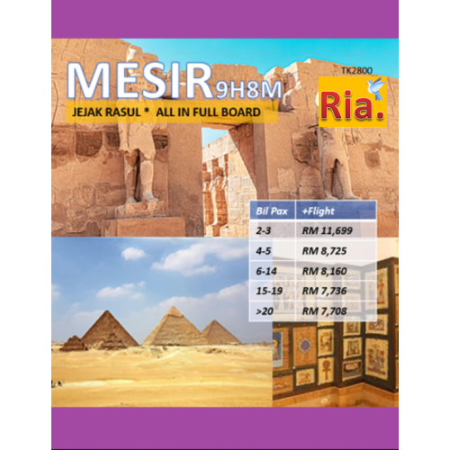 Tempat Lawatan: Cairo, Alexandria, Al-Faiyum, Sinai, Dahab, Sham-El-Sheikh. | Skim Bayaran Mudah dari RM180/bulan x 48 bulan |NOTA: HARGA MUNGKIN BERUBAH MENGIKUT HARGA TIKET PENERBANGAN SEMASA. ITINERARI, HARGA MUKTAMAD DAN TERMA PEMBAYARAN DIMAKLUMKAN DALAM SEBUTHARGA RASMI YANG AKAN DIBERIKAN SETELAH TEMPAHAN DITERIMA.
