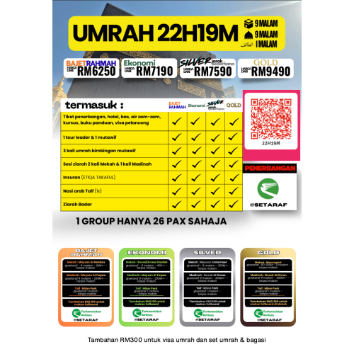 Pakej Bajet Rahmah: Harga dari RM6,250 yang dipaparkan ialah harga untuk musim terendah iaitu bulan Jun-Jul dan untuk bilik ber4. Lain-lain musim surcaj tambahan diantara RM100-RM1,500. Surcaj bilik ber3 ialah diantara RM100-RM2,000 dan bilik ber2 ialah RM200-RM3,000